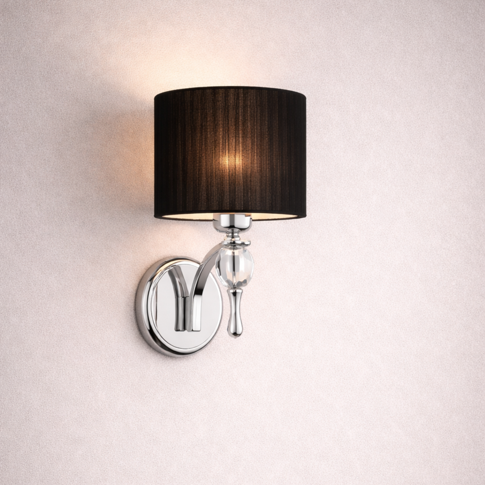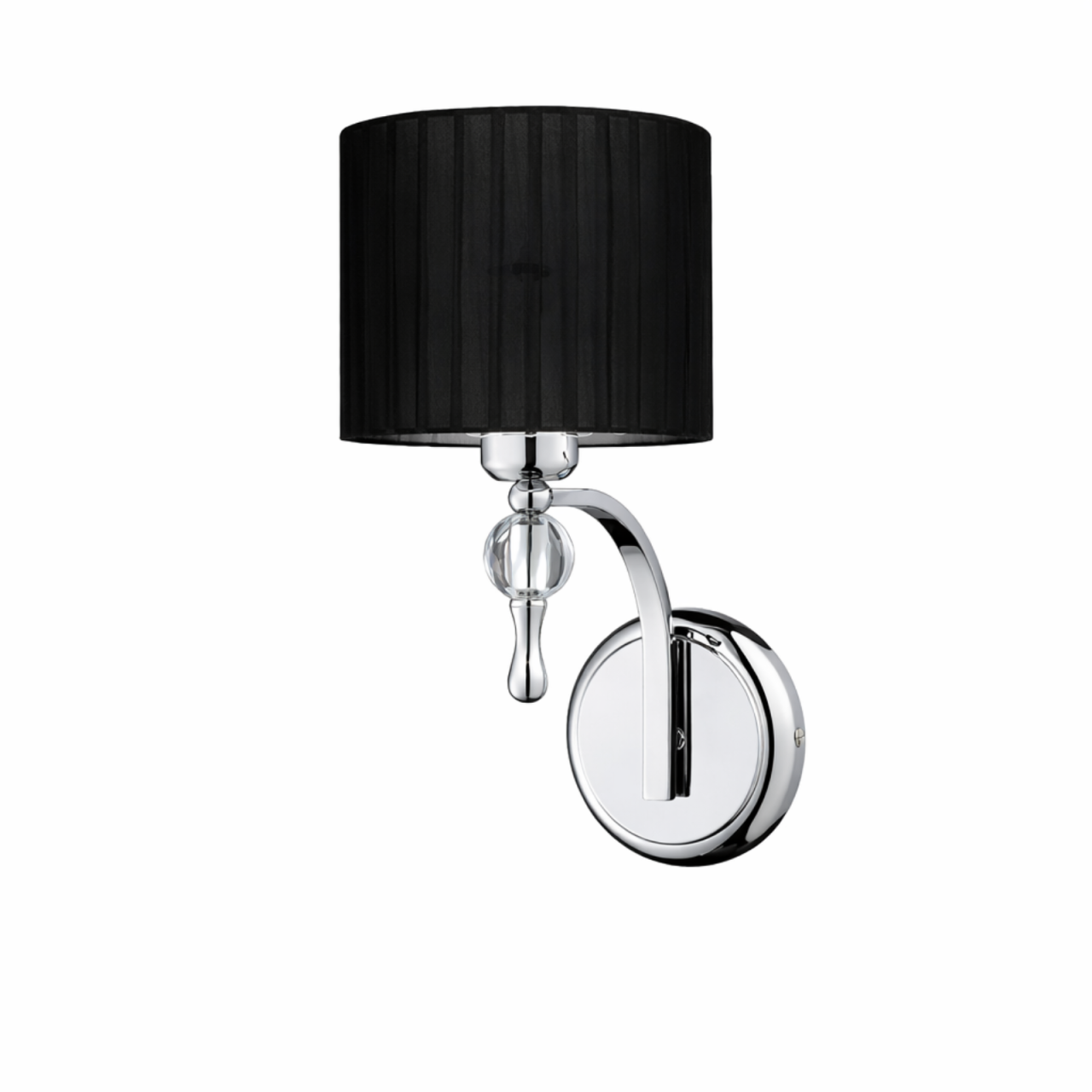 Aplica de perete IMPRESS în finisaj negru cu detalii cromate, soclu E27 și putere maximă 60 W. Design modern ideal pentru hol, living, dormitor sau birou. Bec neinclus. Protecție IP20.