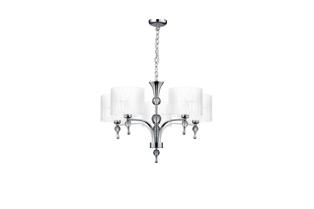 Candelabru IMPRESS 5 AZ1007 de la Azzardo este un corp de iluminat suspendat cu un design clasic‑modern, ce combină cu rafinament țesătura albă a abajurelor cu metalul cromat al structurii. Cele cinci brațe distribuite simetric oferă un efect vizual echilibrat și elegant, ideal pentru spațiile sofisticate.