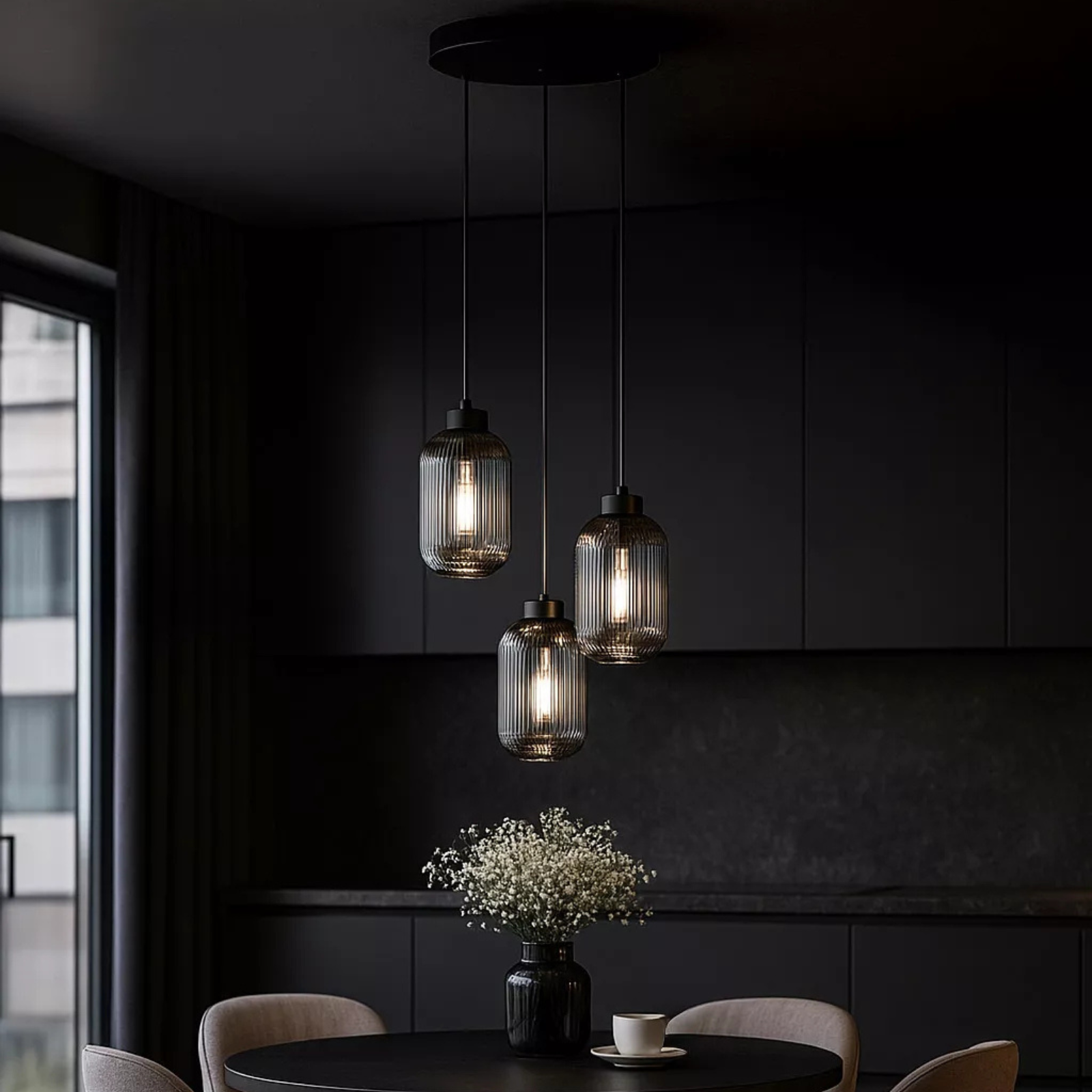 Lampa suspendată K-5755 SILVA este un corp de iluminat modern, cu design elegant și funcțional, ideal pentru iluminarea zonelor precum diningul sau bucătăria. Modelul este prevăzut cu 3 abajururi din sticlă grafit ryflată, care difuzează lumina într-un mod plăcut și creează o atmosferă confortabilă.
