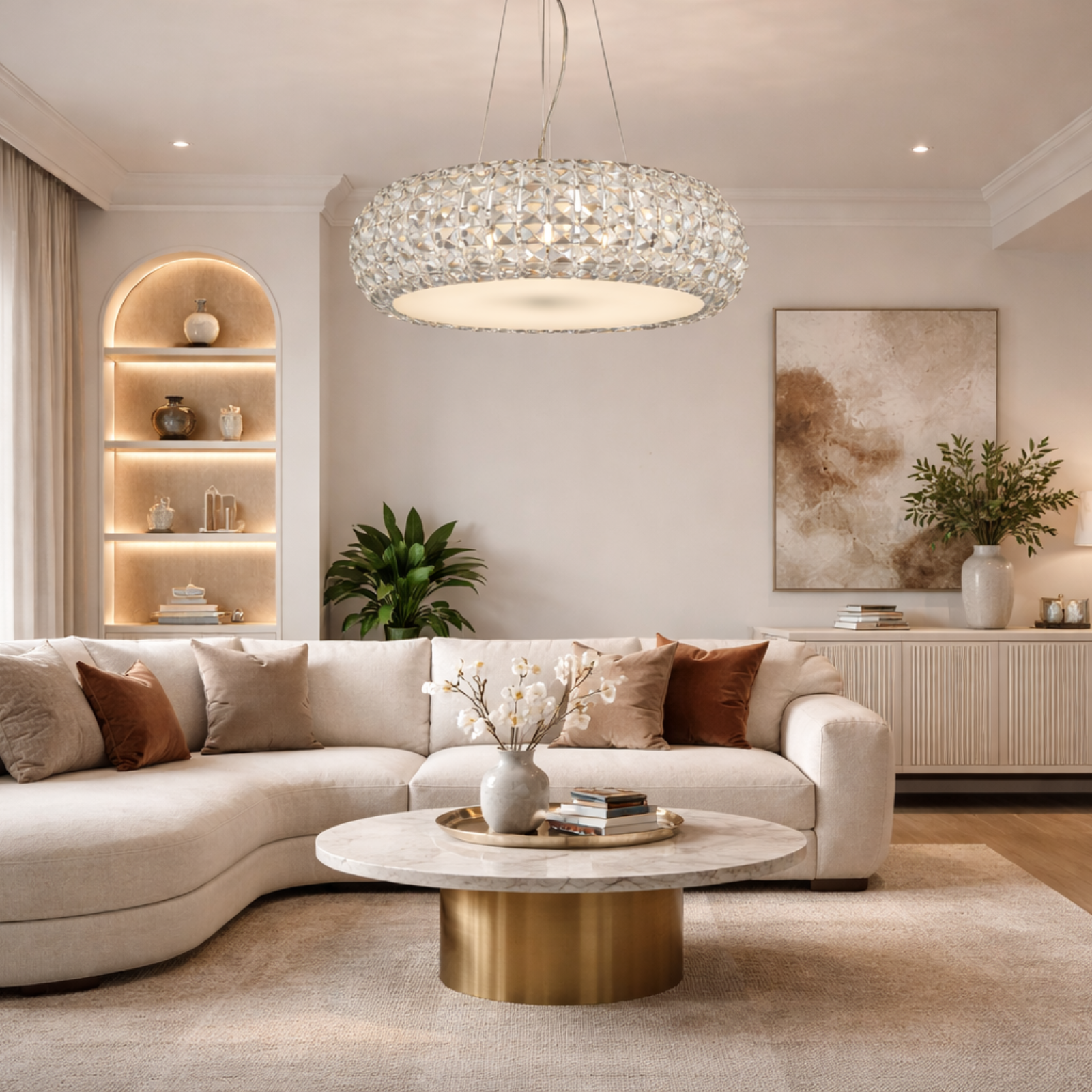 Cu un grad de protecție IP20, lustra este destinată exclusiv utilizării în interior. Designul său modern-glamour, împreună cu detaliile cromate și transparența cristalelor, aduc un plus de eleganță oricărui spațiu, fără a-l încărca vizual.